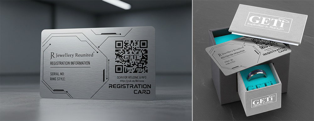 BIRMINGHAM, UK – Leading titanium specialist GETi has announced a high-tech update to its security offerings, providing customers with a durable new way to protect their wedding bands. For a limited period, customers ordering rings with the Jewellery Reunited serial numbering service will receive a complimentary, custom-engraved Brushed Stainless Steel Registration Card.