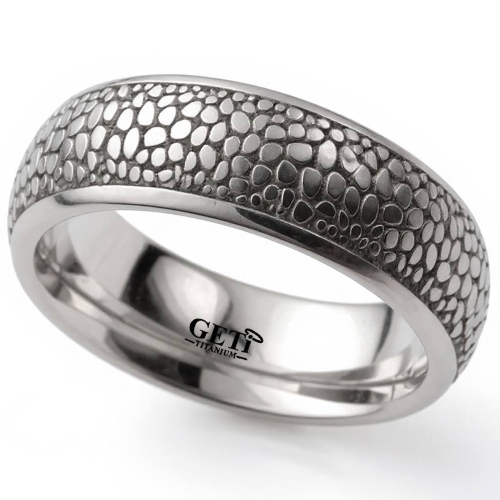 Dome profile Titanium ring with Stingray pattern laser engraved design.
