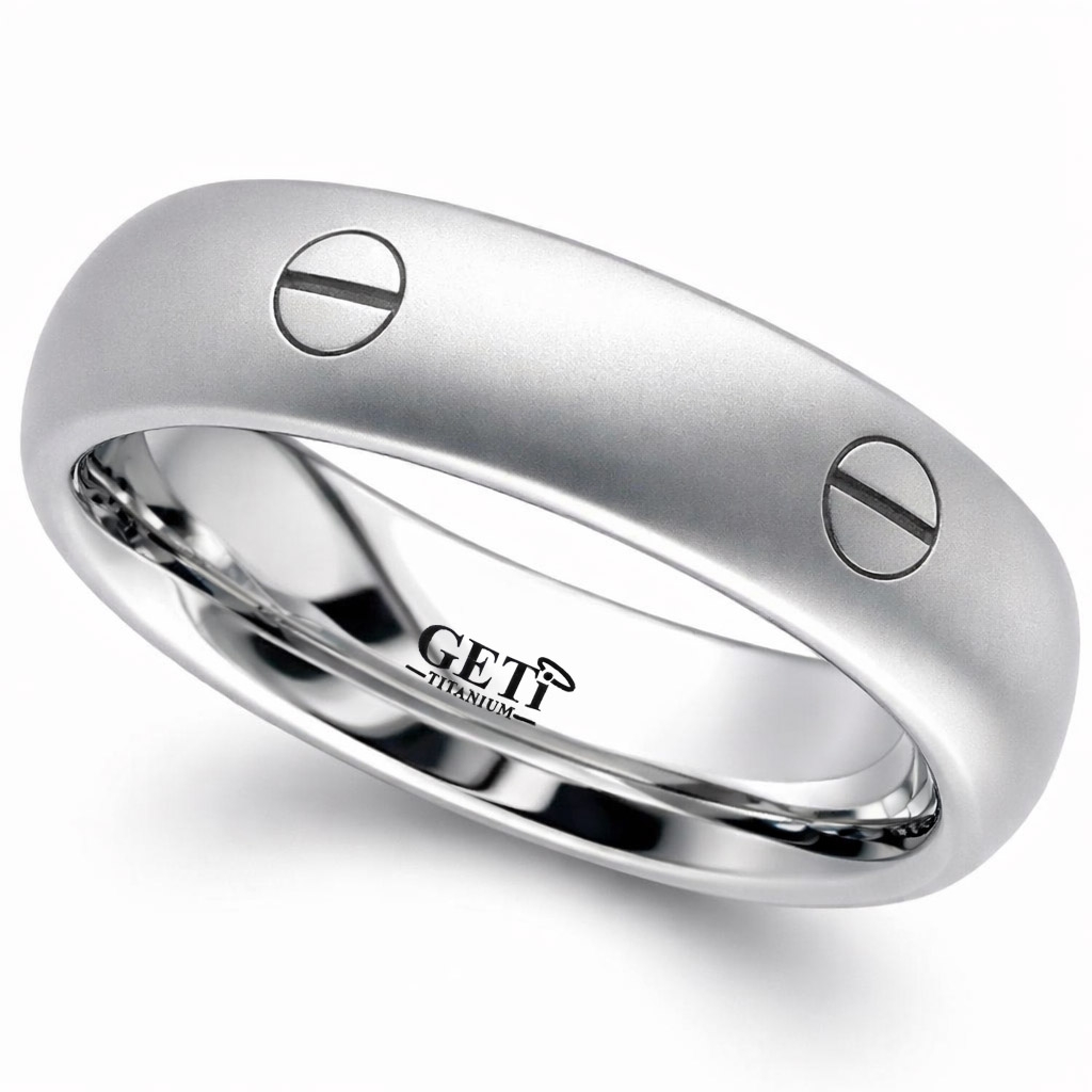 Dome profile Titanium ring with 6 equally spaced screwhead designs around the outside.