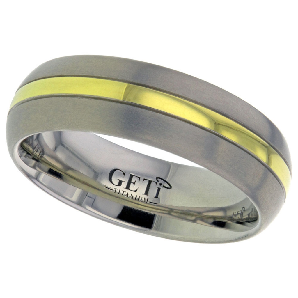 Dome profile Titanium ring with a 1.5mm precious yellow metal inlay, grooved either side.