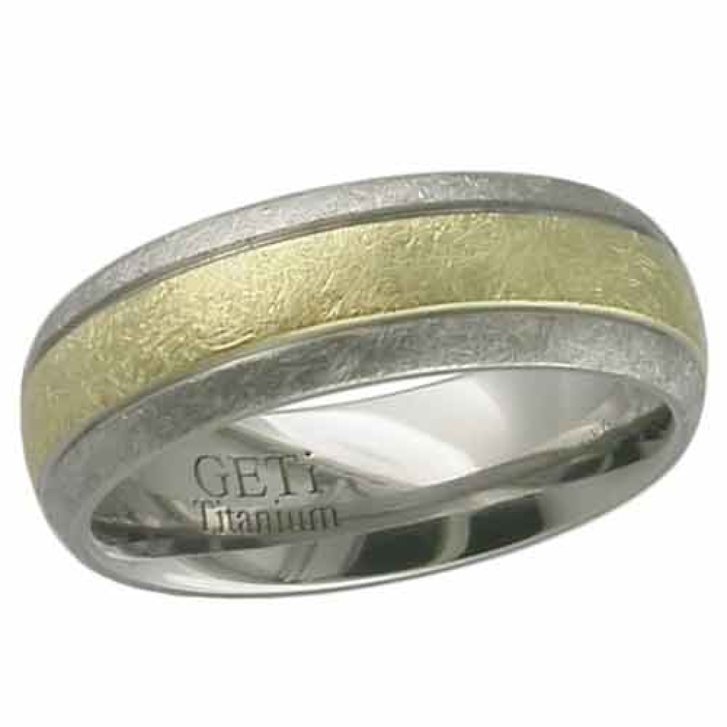Dome profile Titanium rings with 3mm precious yellow metal inlay - grooved. Heavy wire brush finish shown.