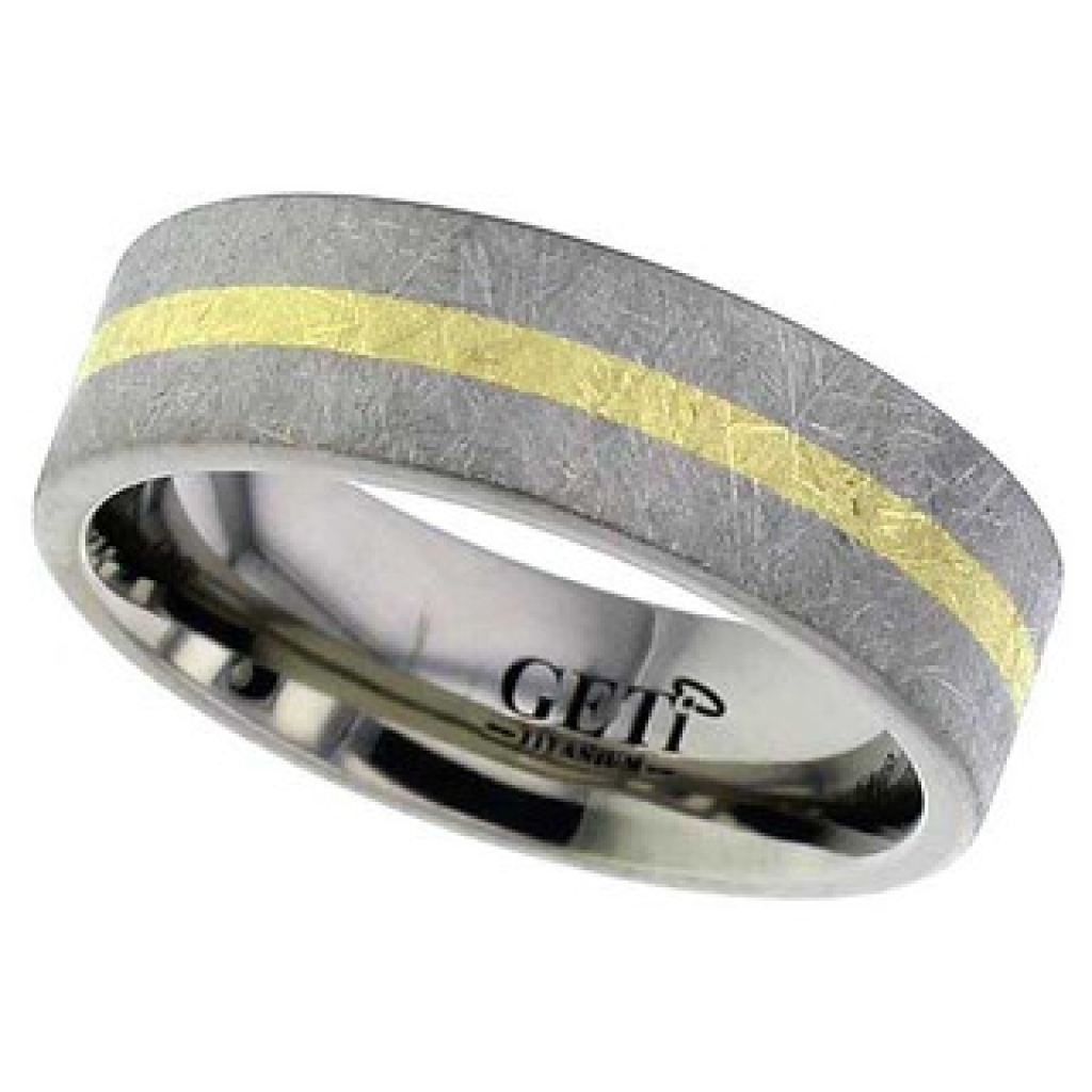Flat profile Titanium ring with 1.5mm wide precious yellow metal inlay and a heavy wire brushed finish.