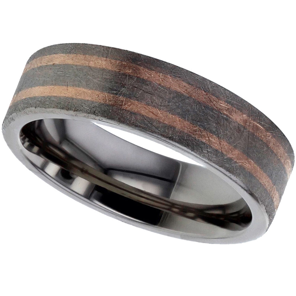 Flat profile Titanium ring with twin precious red metal inlays. (Heavy wire brush finish shown)