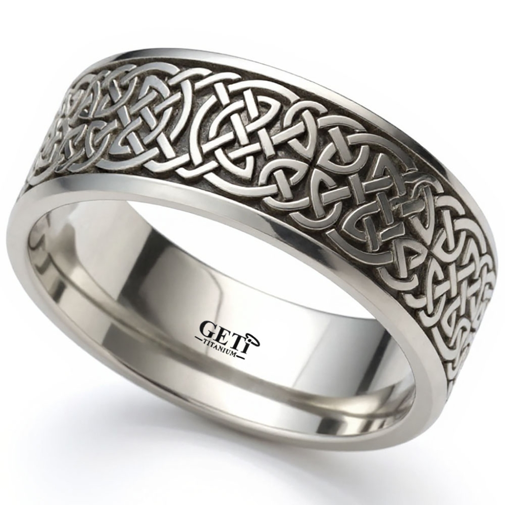 Flat profile Titanium ring with laser engraved continuous Celtic knot detail.