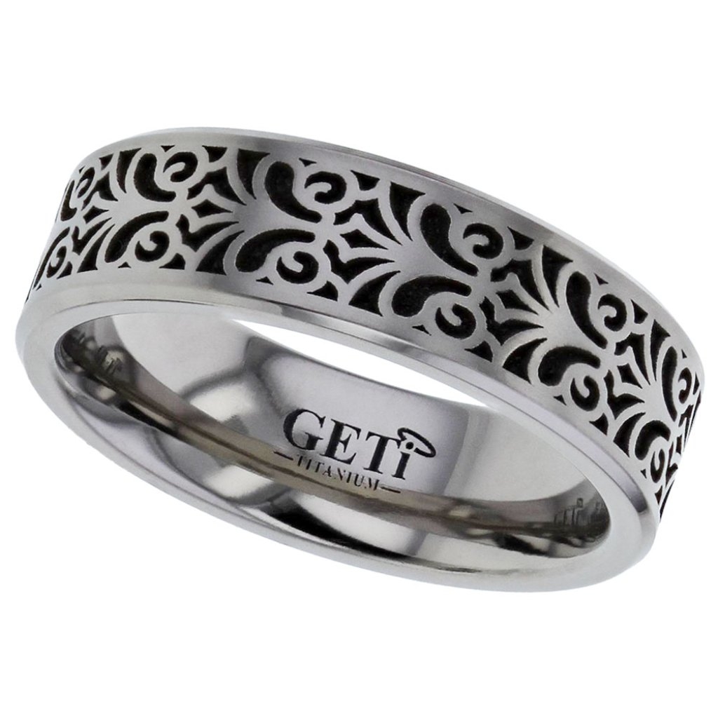 Titanium ring - flat profile, chamfered edges with inverted laser engraved pattern.