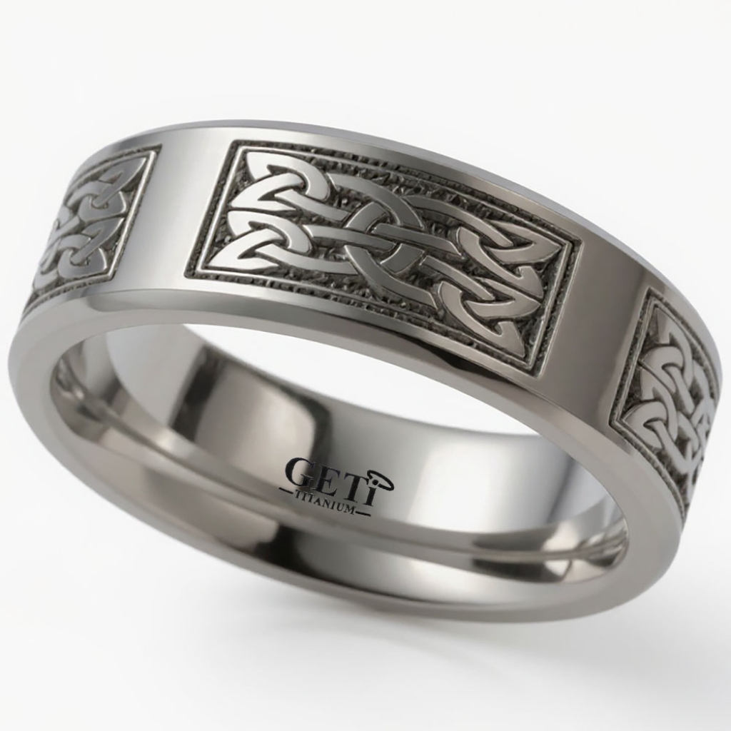 Flat profile Titanium ring with chamfered edges and laser engraved Celtic knots. The design is repeated 5 times where possible but on smaller finger sizes it may be less.
