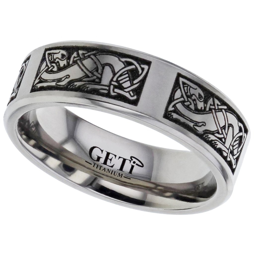 Flat profile Titanium ring with Celtic animal design repeated 5 times (depending on finger size) around the ring.