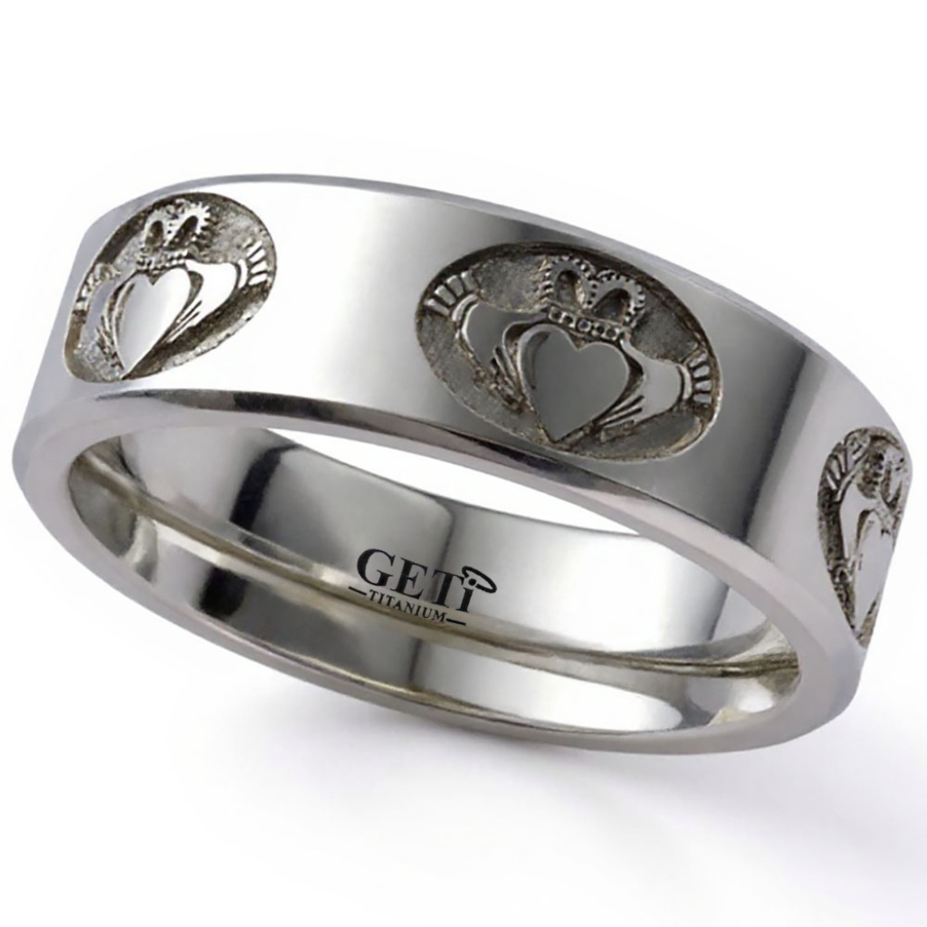 Flat profile Titanium ring with chamfered edges and laser engraved multi-Claddagh design. The design is repeated 6 times where possible but on smaller finger sizes it may be less.