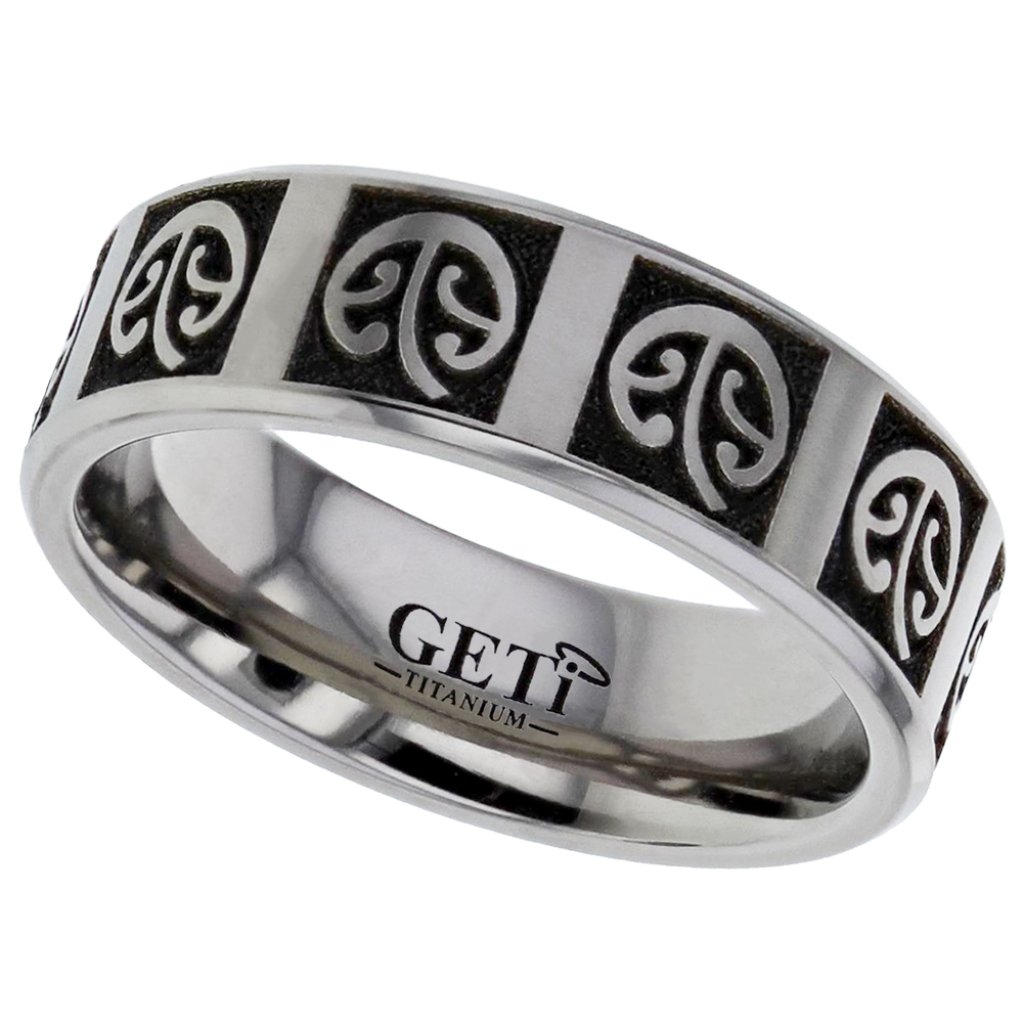 Flat profile Titanium ring with chamfered edges and laser engraved New Zealand Koru fern design. The design is repeated 10 times where possible but on smaller finger sizes it may be less.