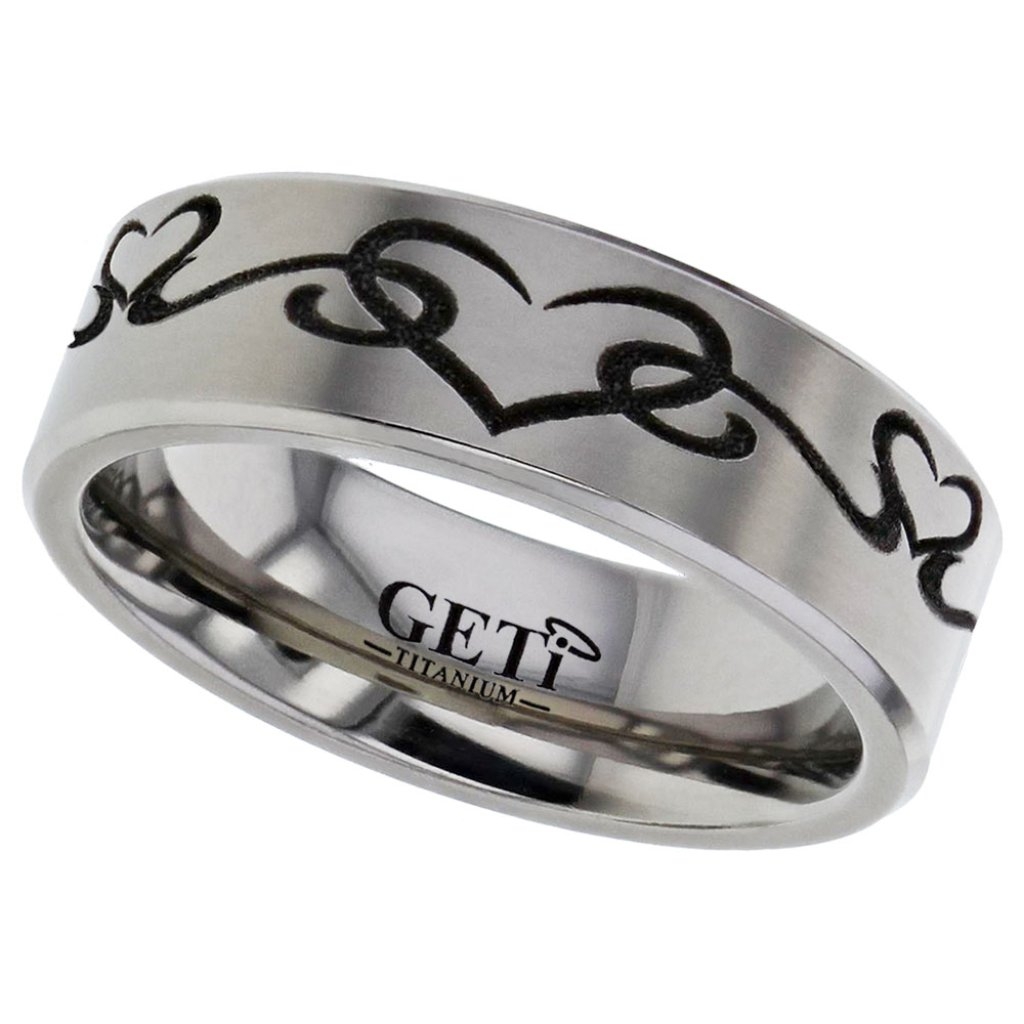 Flat profile Titanium ring with chamfered edges and laser engraved tribal love heart design.