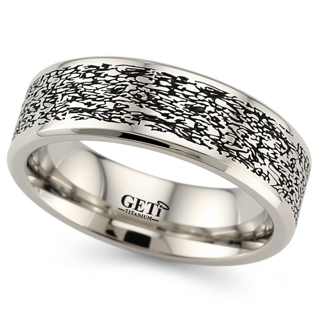 Flat profile Titanium ring with chamfered edges and laser engraved textured design.