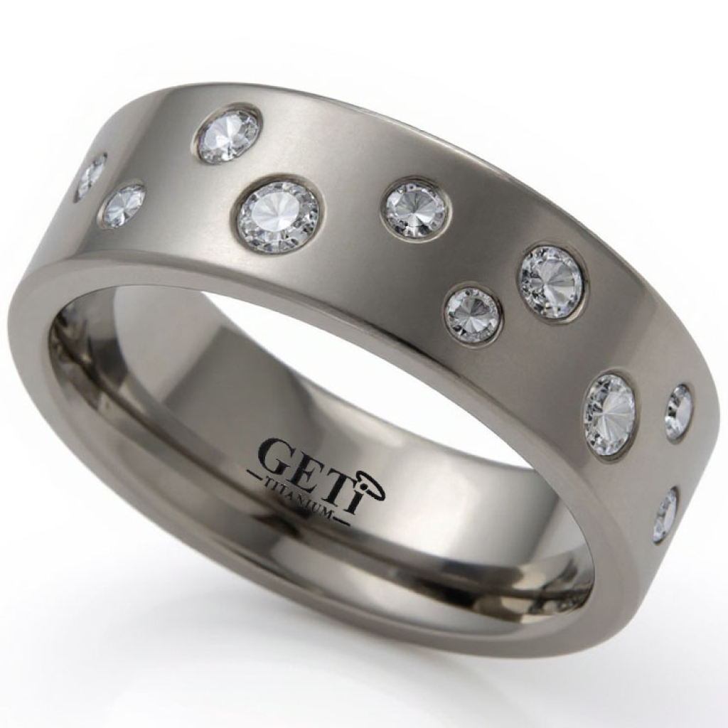 Flat profile Titanium ring set with 10 brilliant cut round diamonds in a random scattered pattern - 2 x 6pnt, 2 x 3pnt 6 x 2pnt - total diamond weight 0.3ct