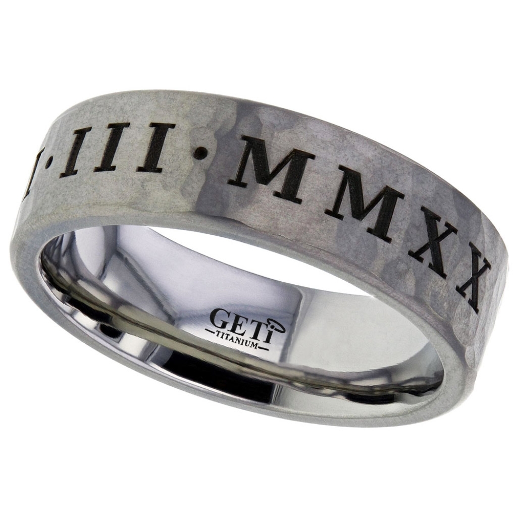 Flat profile hammered Titanium ring with external Roman Numeral laser engraved date.