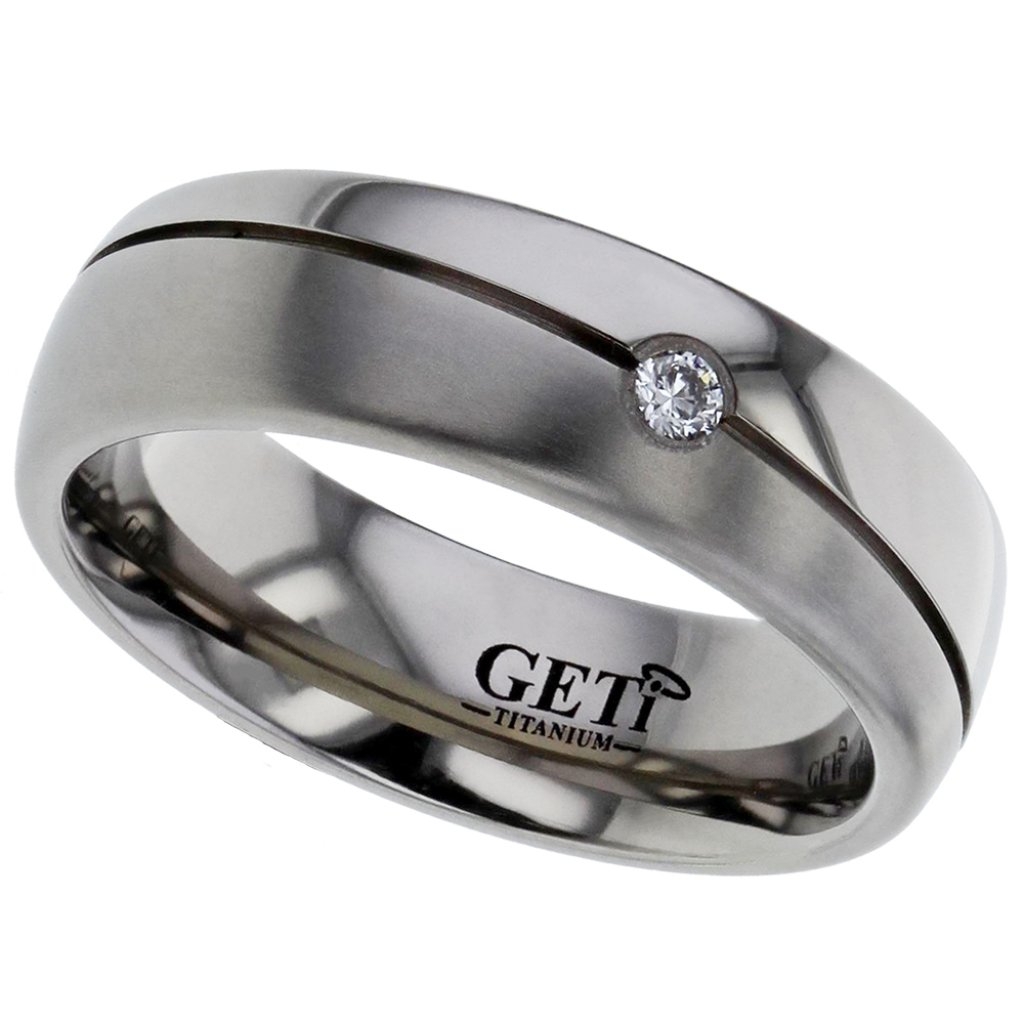 Flat profile Titanium ring with a single diagonal line, set with 1 x 2.5mm diameter (6pnt) round white diamond, and a twin finish, satin/polish.