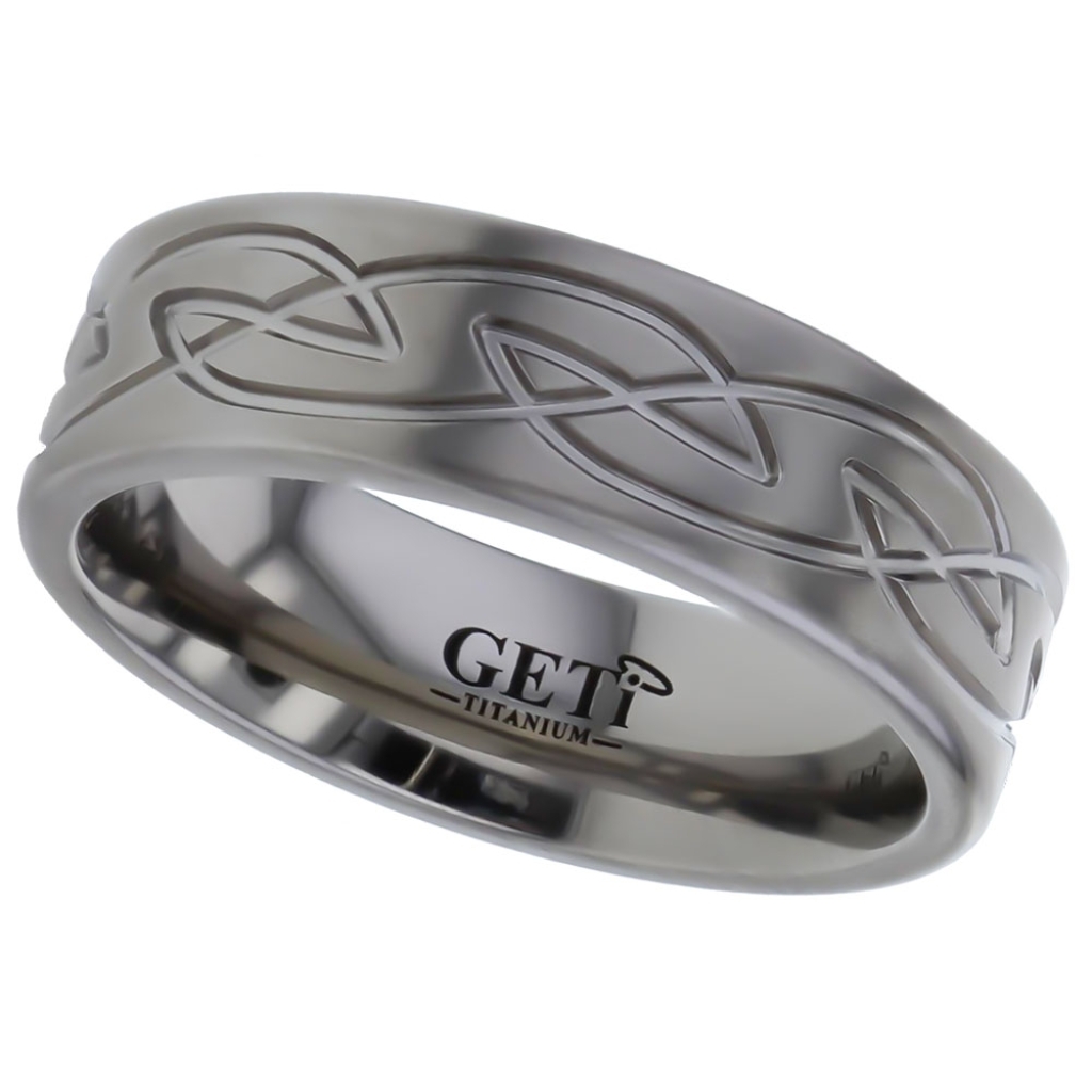 Flat profile Titanium ring with Celtic knot design. Please note that the width of the knot pattern remains the same for all ring widths.