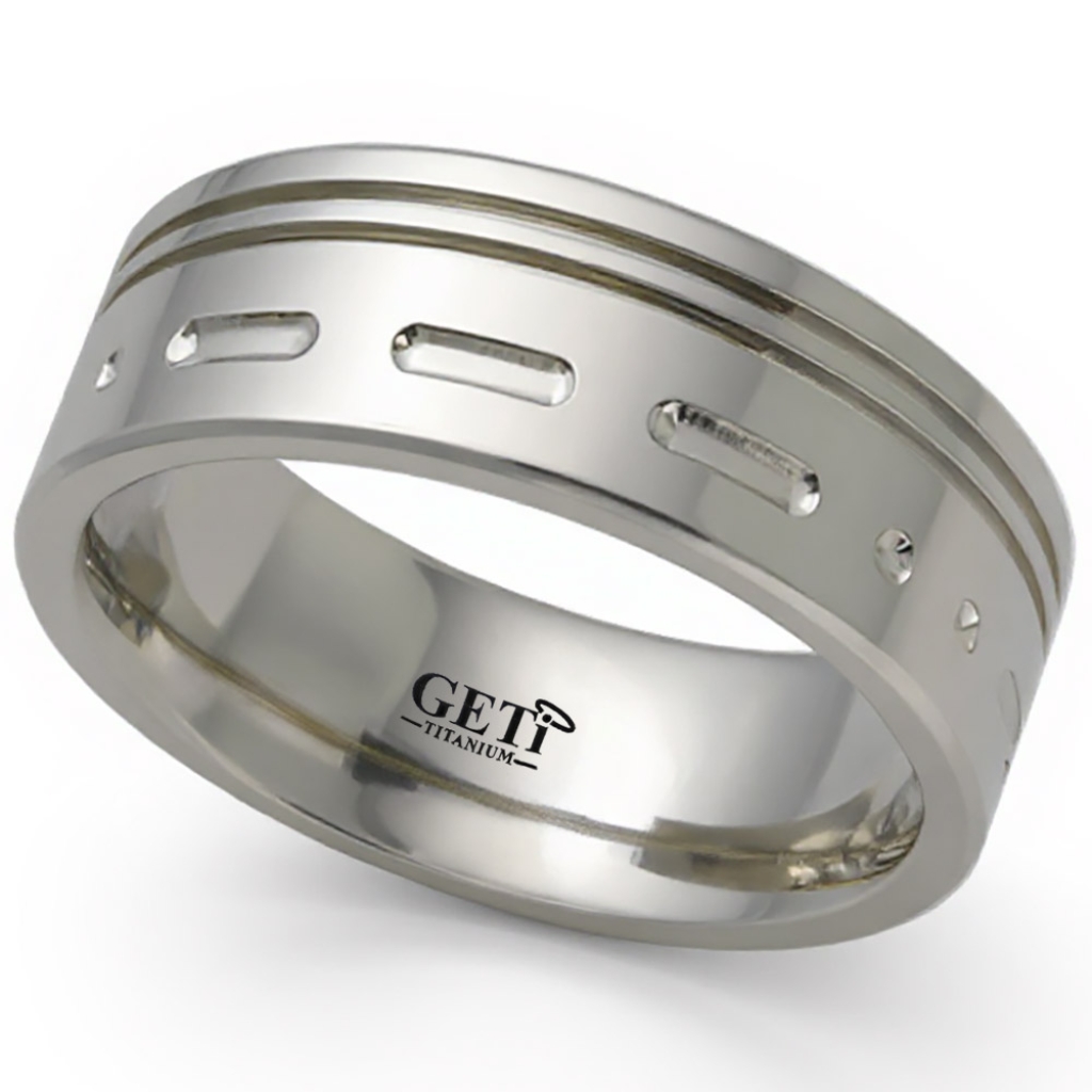 Flat top court Titanium ring with a twin offcentre accents and machined morse code symbols. (The sample image shows the word 'LOVE' machined in morse code - other possibilities available, please enquire with your requirements.)