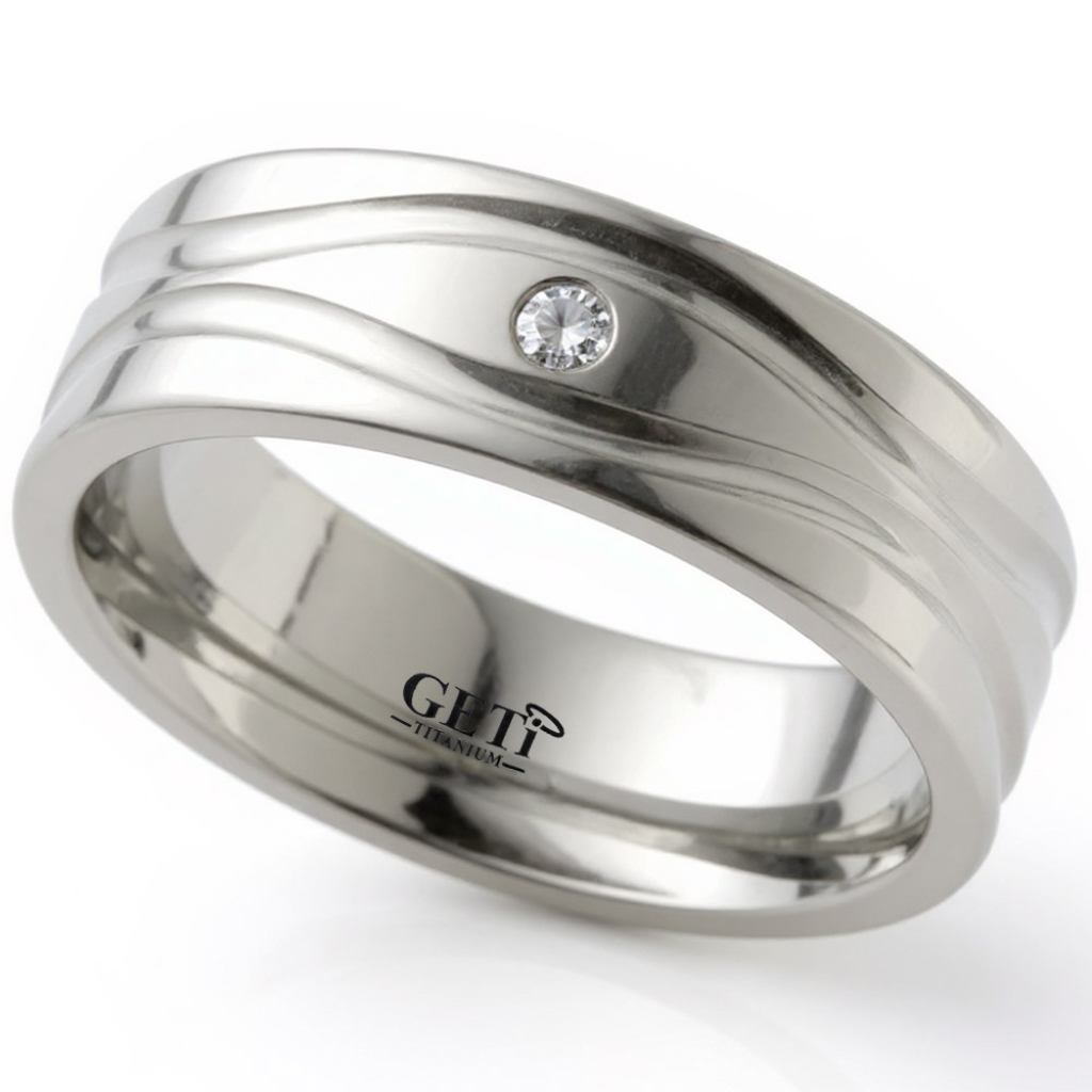 Flat profile Titanium ring with twin wavey line and set with 1 x 3pnt diamond.