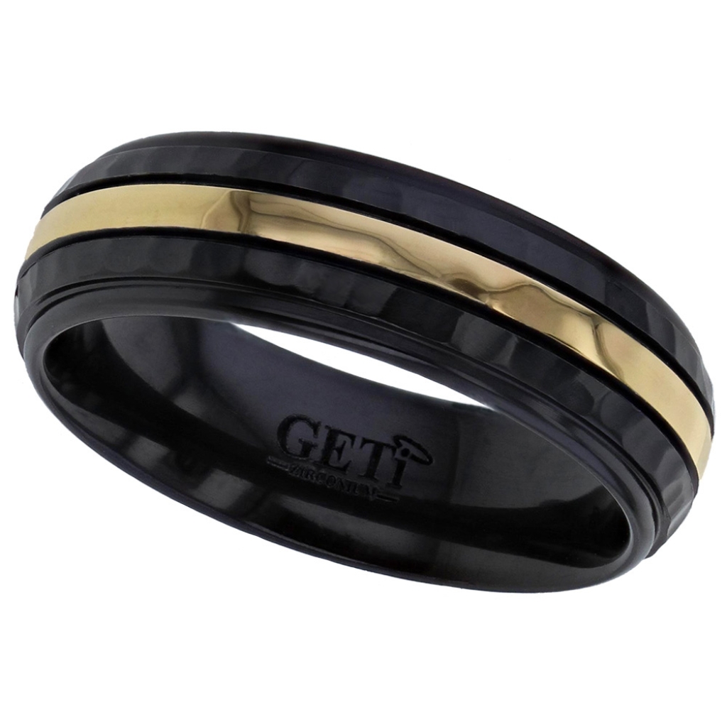 Shouldercut dome profile Black Zirconium ring with grooved central precious yellow metal inlay and a hammered texture. *Please note that our Express Manufacture Service does not apply to this product*
