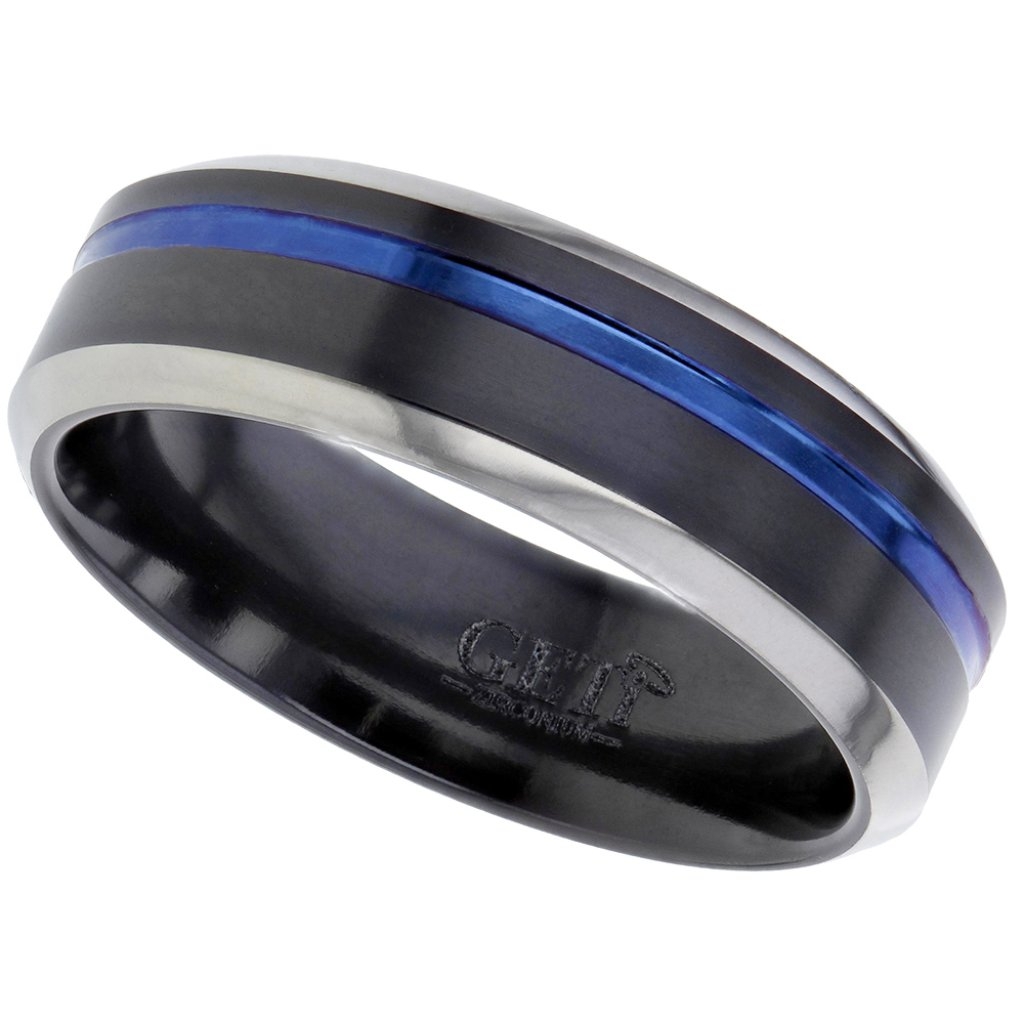 Satin flat black top profile Black Zirconium ring with an off-centre electro-anodised groove and chamfered natural edges.