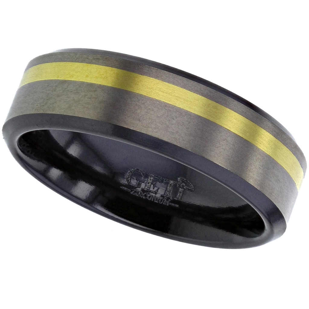 Flat profile Black Zirconium ring with a 1.5mm wide off-centre precious yellow metal inlay. The top surface is re-machined after blacking to reveal the natural colour of the Zirconium once again, leaving the chamfers, sides and inside black. *Please note that our Express Manufacture Service does not apply to this product*