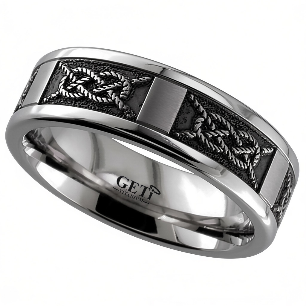 Flat profile Titanium ring with twin defining edge grooves and six equally spaced Carrick knot lasered designs(amount of designs may vary depending on finger size).