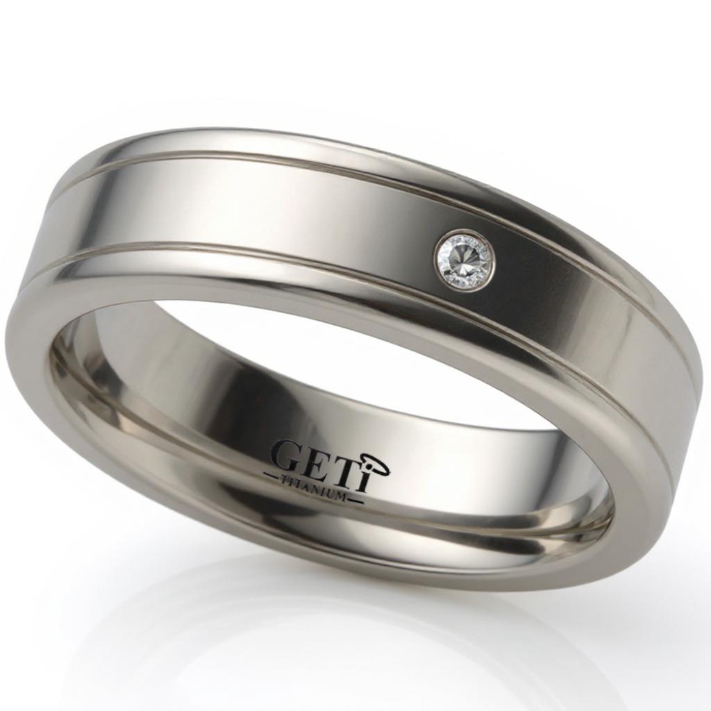 Flat twin finish, grooved Titanium ring with a single 6pnt (2.5mm diameter)