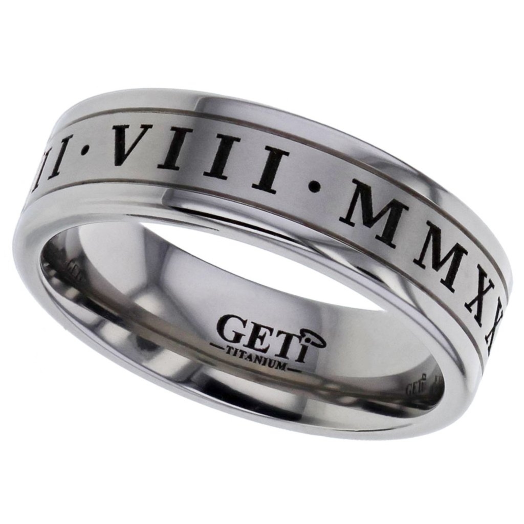Flat profile Titanium ring with twin grooves and external engraved Roman Numeral date of your choice. Please enter your Roman Numerals in the comments box when ordering. We can translate the date for you if you are unsure of how it converts to Roman Numerals.