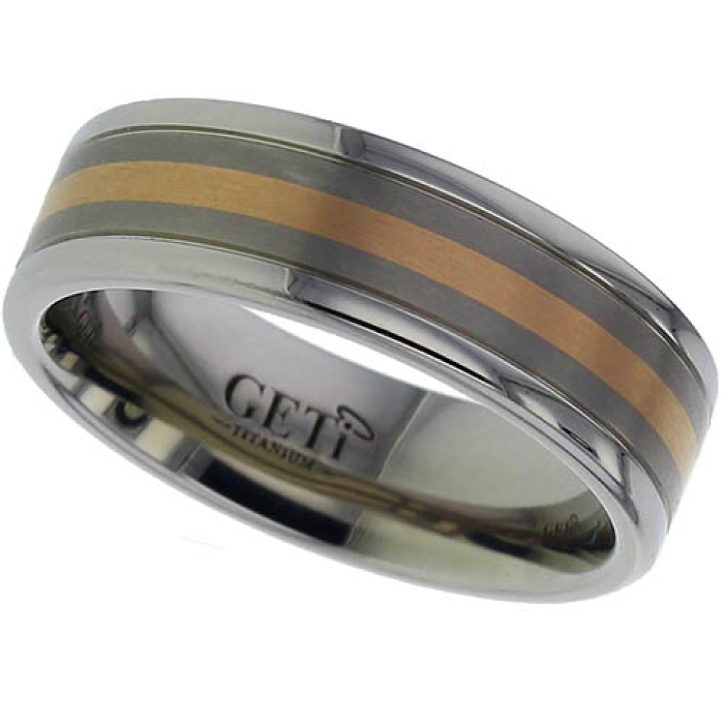 Flat profile Titanium ring with a 1.5mm precious red metal inlay, grooved either side.