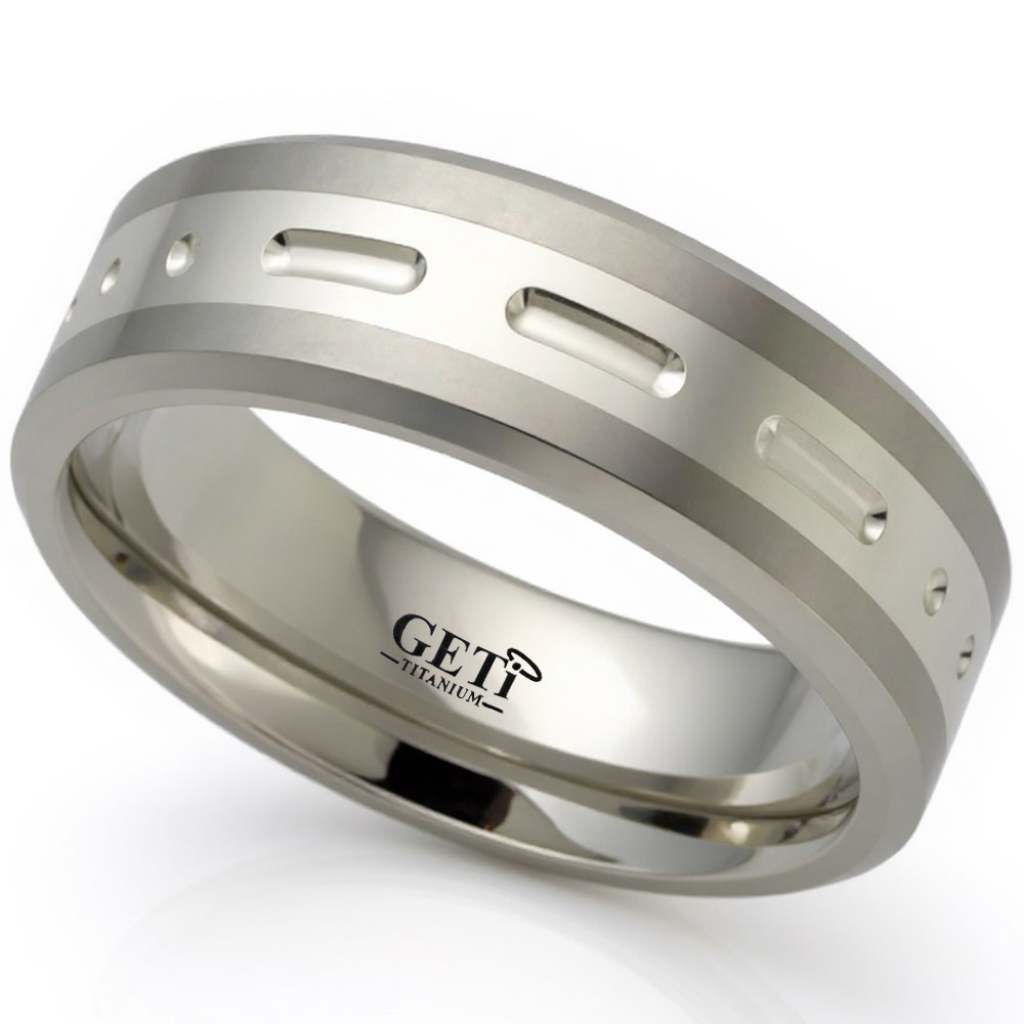 Flat profile titanium ring with twin grooves and machined Morse Code central detail. (LOVE) Other options available.
