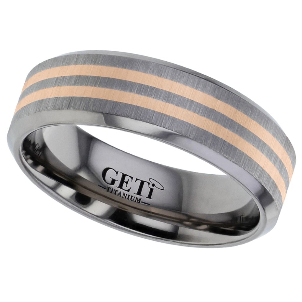 Flat profile Titanium ring with two 1mm red precious metal inlays, polished chamfered edges and a 90 degree linished top.