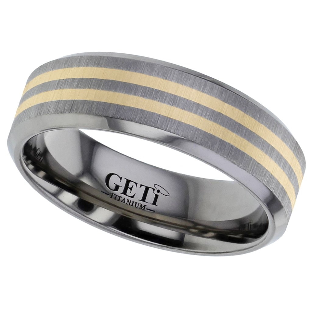 Flat profile Titanium ring with two 1mm yellow precious metal inlays, polished chamfered edges and a 90 degree linished top.