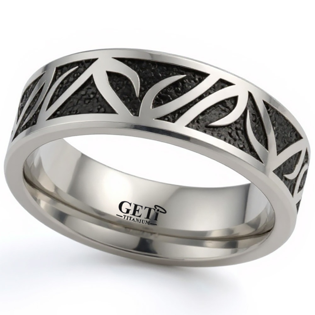Flat top court Titanium ring with chamfered edges and lasered design.