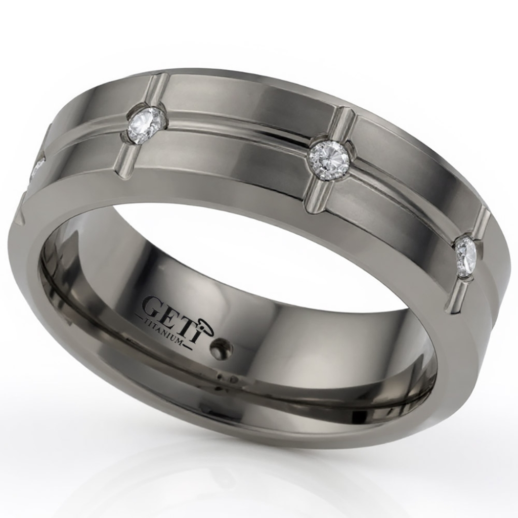 Flat profile, segmented Titanium ring, chamfered edges set with 8 x 3pnt (2mm diameter) round brilliant cut diamonds SI - G/H