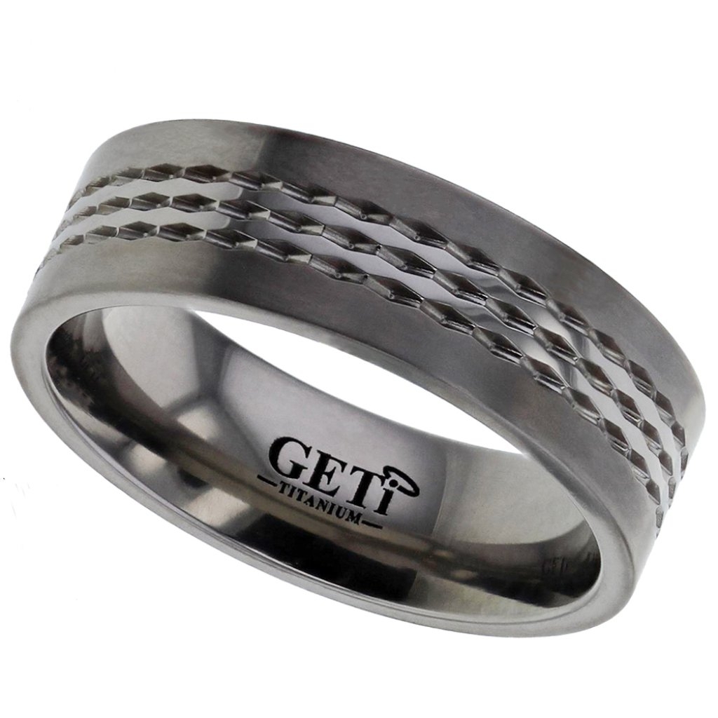 Flat profile Titanium ring with chain style design and satin finish.