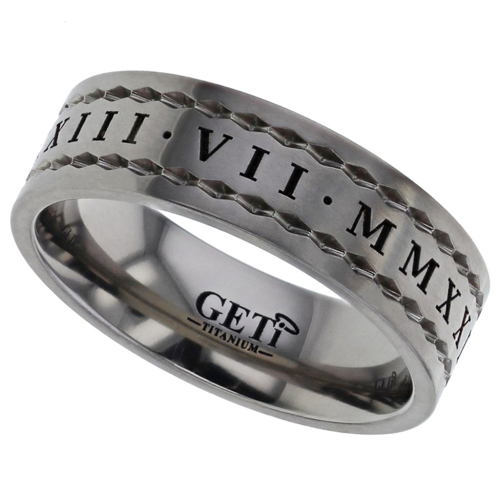 Flat profile Titanium ring with laser engraved Roman Numerals and chain-style design.